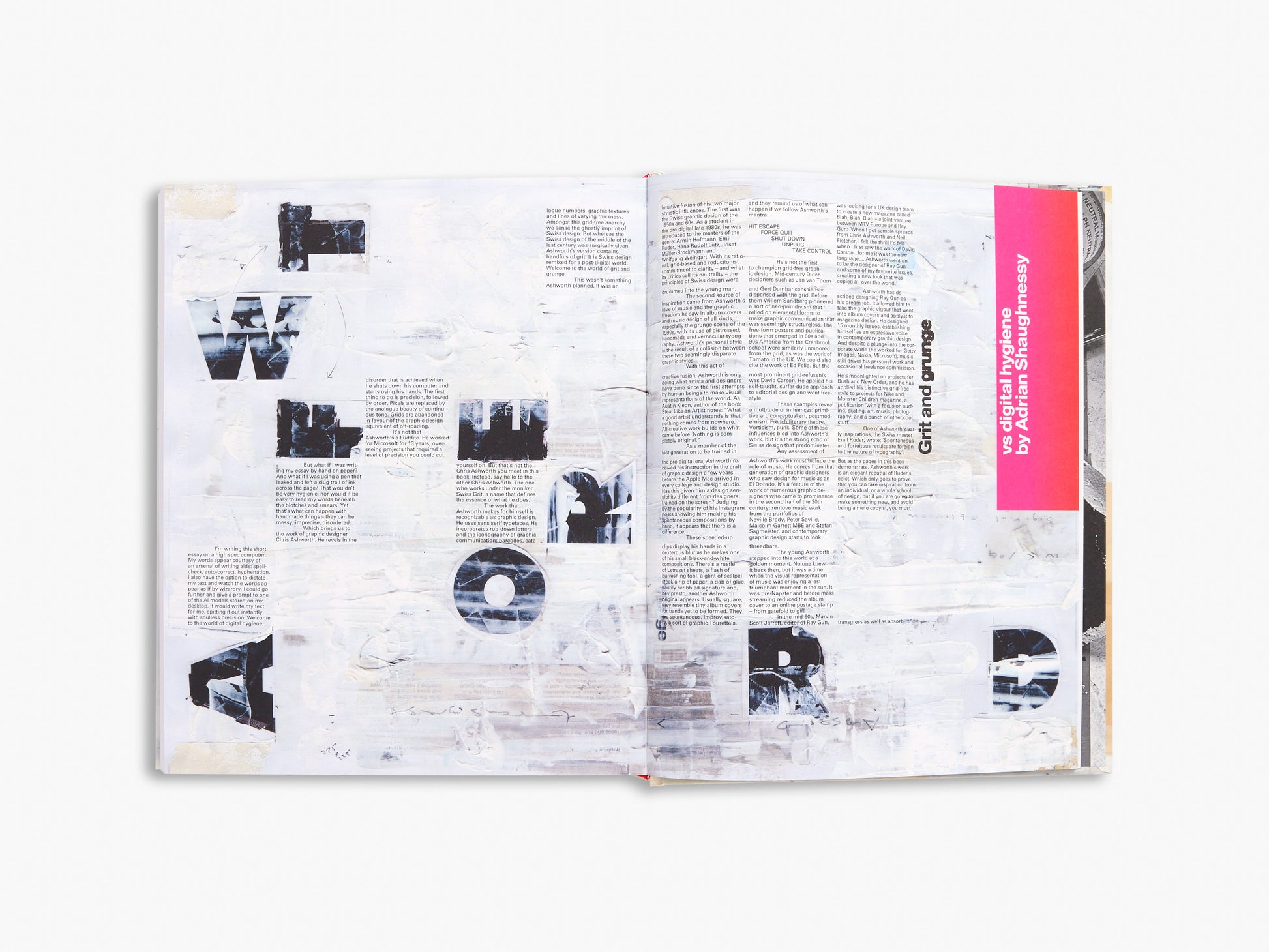 Covering work made from 1997 to 2024, the book features 488 pages of published and unpublished work from Ray Gun (issues 44–58), alongside marked-up chromalins, diary entries and discarded early layouts. Disorder charts the development of Ashworth’s career from an independent designer to becoming creative director at Microsoft in Seattle, and brings together a selection of his ‘found-type’ photography and music-inspired artworks. Ashworth sees his work – craft-based, handmade – as a counterpoint to our screen dependent digital culture, and the manifestation of an alternative view, arguing that creative development away from the computer offers unique and precious merits.