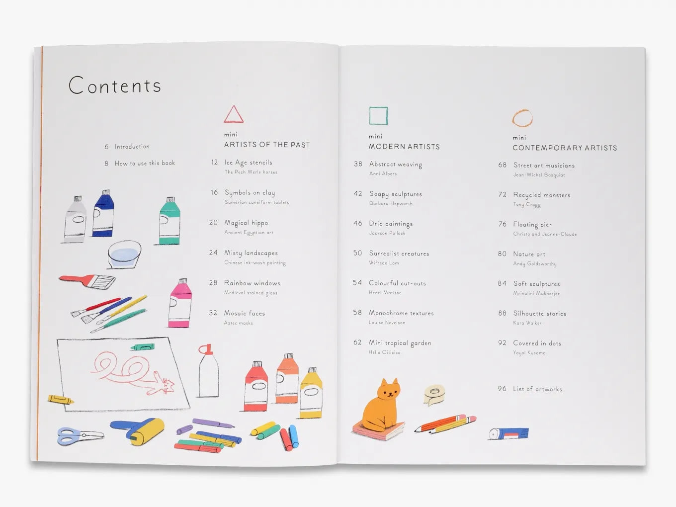 The twenty projects in Mini Artists are designed to engage children with art through making. Mini artists will discover drip painting with Jackson Pollock, carve soap sculptures with Barbara Hepworth, and create their own obliteration room with Yayoi Kusama. They'll also travel through time and explore art from different periods, from cave painting to Medieval stained-glass, and Chinese ink painting to washable graffiti inspired by Jean-Michel Basquiat.