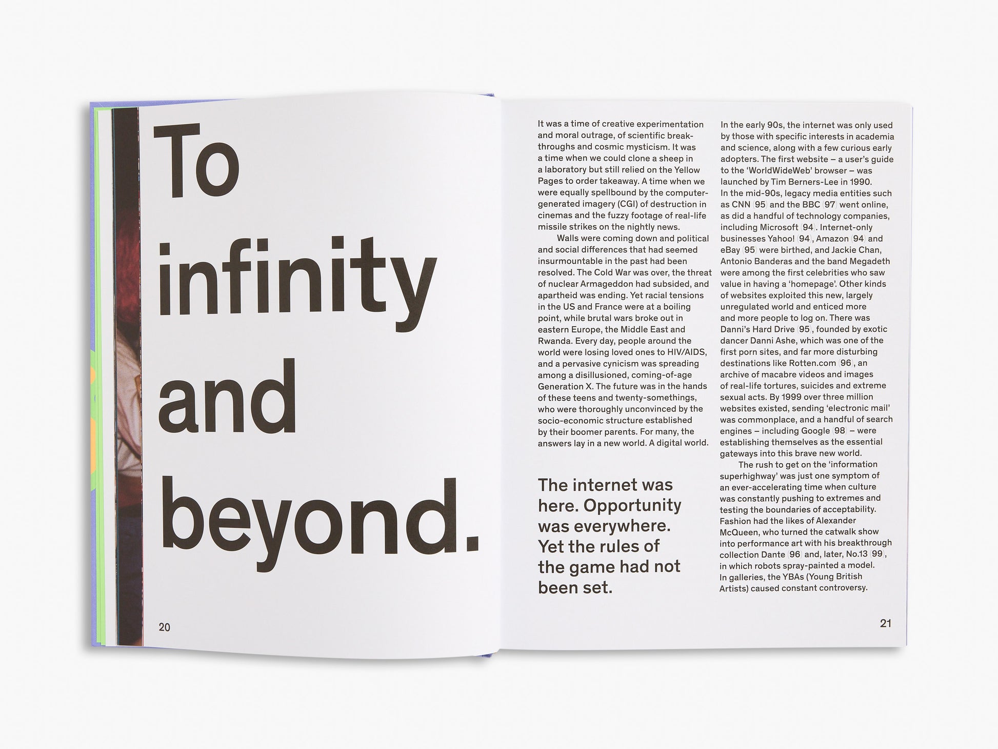 And so we had the first flashes of reality TV, the O.J. Simpson trial, the rise of surveillance culture and the internet. We had early wake-up calls to the world of social media as The Truman Show and The Blair Witch Project exploited the emerging visual language of DIY video content. We heard the rallying call of ‘Girl Power!’ from riot grrrls and the Spice Girls. We argued over East Coast versus West Coast rap and Biggie versus Tupac. Ice-T went from ‘Cop Killer’ to TV detective and Will Smith went from the Fresh Prince to a man in black. Cults, crop circles and conspiracy theories spread, and The X-Files and The Matrix pulled back the curtain on fictional hidden truths. It was the end of history and it was print’s last hurrah – or so we thought.